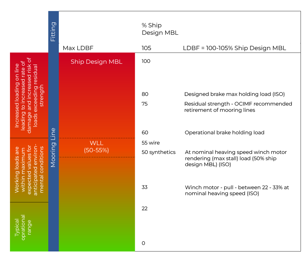 In the mooring context, MEG 4 defines WLL as the maximum load that a mooring line should experience in service, expressed as a percentage of the ship’s design MBL. Steel-wire ropes use 55 %, synthetic ropes 50 %, of the ship design MBL.